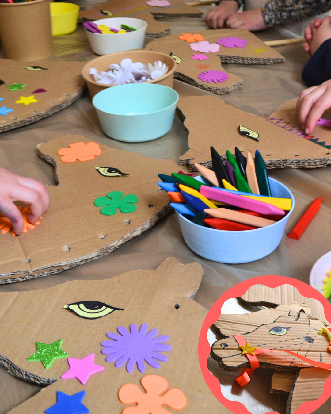 - Atelier DIY : customisation d'un poney/cheval de bois (laine, stickers, feutres, rubans, strass, ...)
